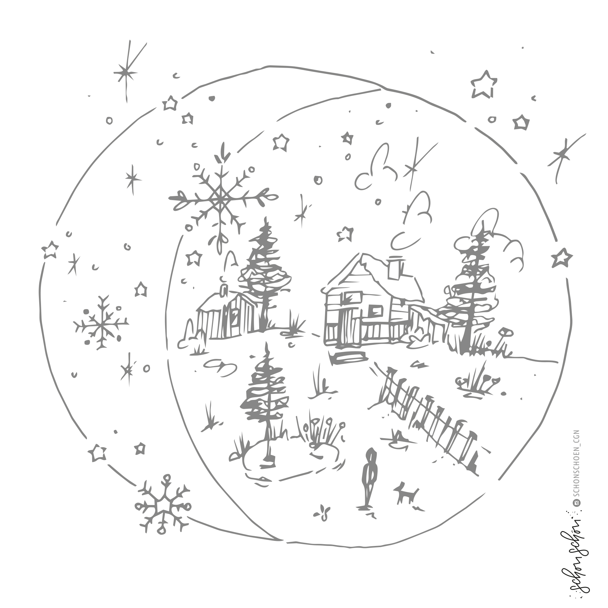 A snow-covered house, softly glowing windows, and delicate lines capture the tranquil mood of winter. Cool blue and gray tones, tiny snowflakes, and loving details lend the motif a special depth and bring the scene to life with atmosphere.