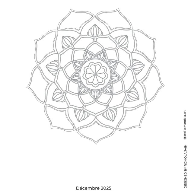 Le mandala "Lyra" a été imaginé par Romola Jain à partir de sa méthode Création Mandala®. Il s’inspire de l’esprit festif de décembre avec un tracé tout en rondeur, qui évoque une suspension ou une boule décorative.