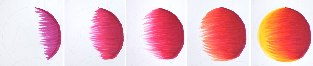 Begin met de kleur P757 port red met de penseelpunt rechtsboven en laat de kleur naar het midden van de maan toe uitlopen. De pennenstreken moeten passend bij de kromming van de cirkel een beetje gebogen zijn. Hetzelfde doe je van donker naar licht met de overige kleuren (zwart laat je weg).