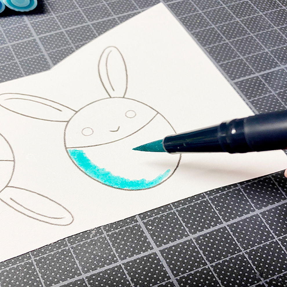 Met de penseelpunt van de ABT Dual Brush Pen kun je nu de ene kant van het paasei inkleuren. Dankzij zijn inkt op waterbasis kun je de kleur nu met water verdunnen en over het hele ei verdelen. Trek met je penseel gewoon de kleur van links naar rechts. Daardoor krijg je aan de linkerkant een donkere rand. Dessins als streepjes en puntjes liggen voor paaseieren eigenlijk voor de hand. Laat je eigen creativiteit gerust vrije loop!
