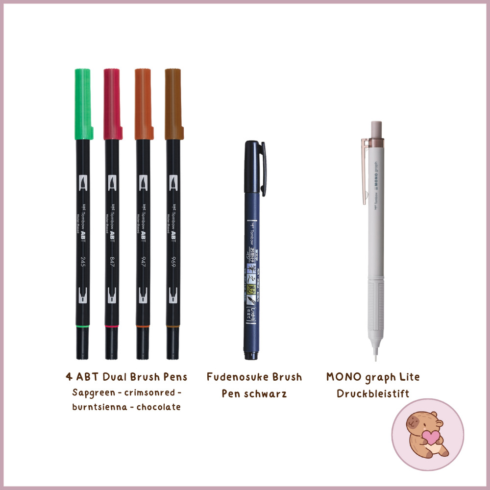 Alles-in-één set voor schattige capibara-illustraties in kawaii-stijl. 4 ABT dubbele penseelpennen, Fudenosuke-penseelpen en MONO graph lite vulpotlood.