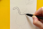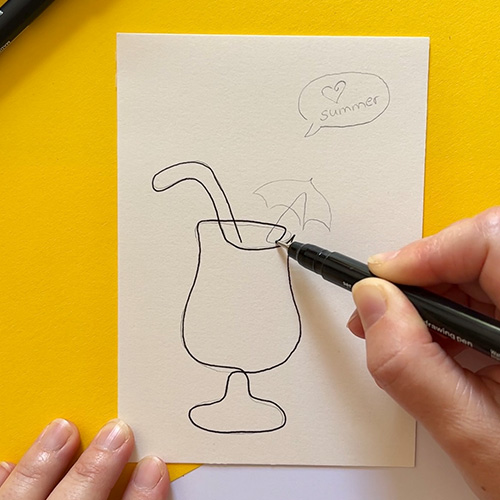 Übertrage die Vorlage auf dein Papier und zeichne im nächsten Schritt das Cocktailglas & Sprechblase mit dem MONO Drawing Pen nach. Achte darauf, dass die Linie flüssig und durchgehend ist.