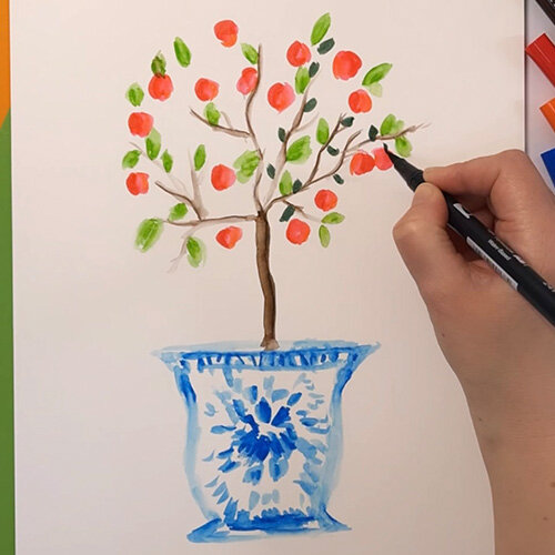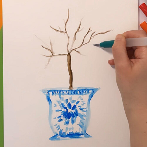 Zuerst beginnen wir mit der Vase. Nimm dir deine Blautöne und zeichne die Umrisse der Vase. Anschließend verwendest du deinen Wassertankpinsel, um die blaue Farbe leicht verlaufen zu lassen, sodass ein cooles Muster für deine Vase entsteht.