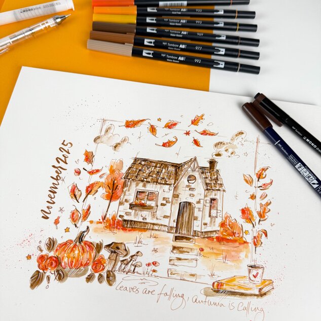 Met ABT Dual Brush Pens, MONO Drawing Pens en Fudenosuke-stiften kun je de kleuren en contrasten van de herfst perfect benadrukken en je kunstwerk een persoonlijk tintje geven.